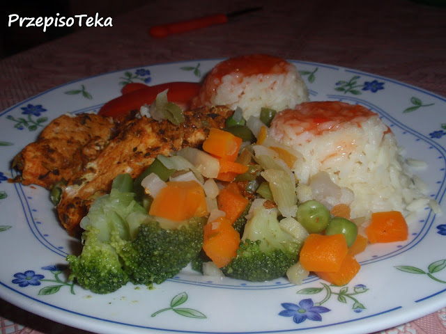 Na parterze (garnka) wrzucamy gotujemy ryż z dodatkiem oliwy (lub masła jeśli chcesz, aby Twój ryż był lekko żółty) i soli. Pierś z kurczaka kroimy w dowolnej wielkości kawałki i marynujemy w przyprawach z dodatkiem odrobiny oliwy. Dobrze by było, aby pierś nasiąkła przyprawami przez jakieś 2 godziny, ale nie jest to niezbędne. Tak zamarynowaną pierś wrzucamy na kolejne piętro naszego garnka do gotowania na parze. Ostatnie piętro to mieszanka warzyw. Świetnie pasuje tu brokuł. Po 10- 15 minutach kurczak powinien być gotowy. Wszystko układamy na talerzyku. Ryż można polać sosem sweet chilli.
